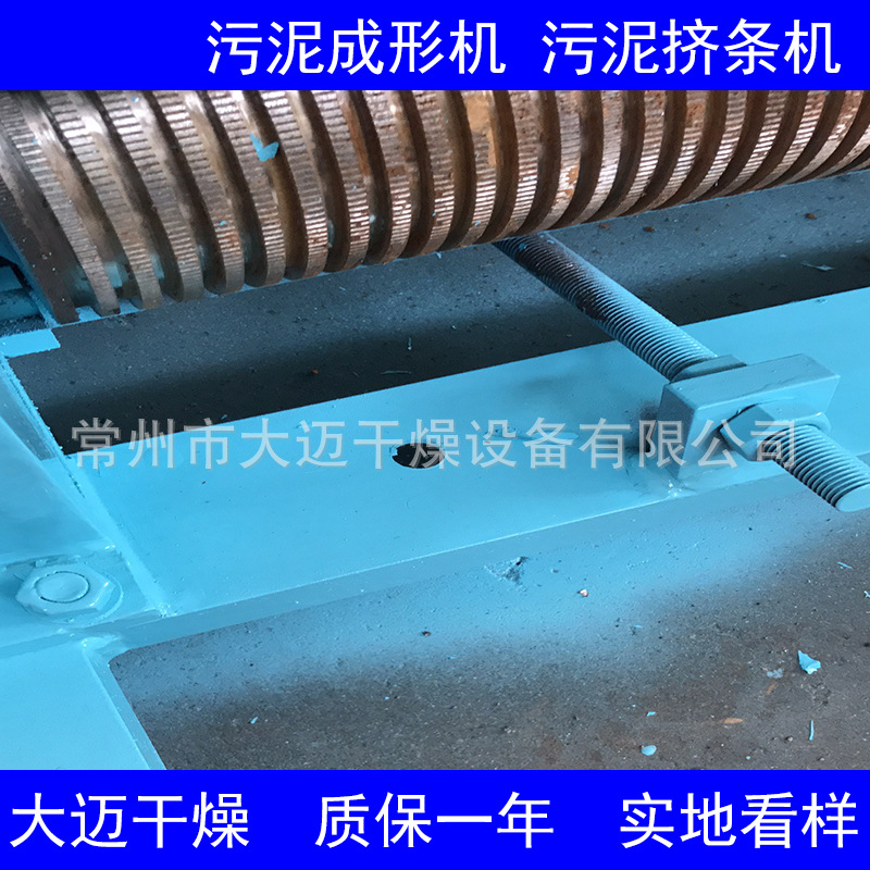 污泥成型機(jī),包括裝泥箱和成型滾筒,所述裝泥箱的頂部設(shè)有進(jìn)料口,裝泥箱的底部設(shè)有出料口,所述成型滾筒設(shè)置在裝泥箱的出料口處;所述裝泥箱內(nèi)于成型滾筒的上方設(shè)有攪拌加壓刀,所述攪拌加壓刀包括轉(zhuǎn)軸、驅(qū)動(dòng)所述轉(zhuǎn)軸旋轉(zhuǎn)的驅(qū)動(dòng)機(jī)構(gòu)和呈圓周均勻分布在轉(zhuǎn)軸周邊的兩個(gè)以上的刀片,所述刀片通過(guò)連桿與轉(zhuǎn)軸連接;所述刀片朝向轉(zhuǎn)軸的一面為連接面,背離轉(zhuǎn)軸的一面為加壓面,所述加壓面呈弧形。當(dāng)?shù)镀D(zhuǎn)至最下端時(shí),刀片的弧形加壓面會(huì)對(duì)成型滾筒處的污泥施加一定的壓力,使堆積的污泥吧變得更結(jié)實(shí),并迫使這部分的污泥擠入成型滾筒中進(jìn)行成型,這樣成型出來(lái)的污泥連續(xù)性好,結(jié)實(shí)而不容易松散。 隨著城市建設(shè)的發(fā)展、生活水平的提高,城市生活污泥的生成量也越來(lái)越大,日久堆積十分影響城市環(huán)境及空氣質(zhì)量。目前對(duì)城市生活污泥進(jìn)行批量處理的方法一般為物理方法與生化方法,物理方法一般即為干化處理,即去除污泥中所含的絕大部分水分,再對(duì)剩余的渣料進(jìn)行無(wú)害化處理或轉(zhuǎn)為他用。物理干化處理方式與生化處理方式相比優(yōu)勢(shì)顯著,如處理設(shè)備占用面積小、處理周期短、能耗低、不易造成二次污染等。但是,在物理干化處理方式中,一般首先需要對(duì)污泥原料進(jìn)行成型預(yù)處理,否則難以保證高效、高質(zhì)量的干化處理結(jié)果。 DM系列成形機(jī) 配置雙搗碎和雙對(duì)輥。搗碎主要起打碎大塊物料、控制物料成型速度的作用,大對(duì)輥起到物料成型的作用。可調(diào)變頻器控制減速速機(jī),從而控制加料速度。適用范圍:一般物料都適用。物料成型:長(zhǎng)主形條狀。配套網(wǎng)帶式烘干機(jī)使用。 DM系列成形機(jī) 主要適用于污泥、碳酸鈣生產(chǎn)、鈦、碳黑的擠條、同時(shí)也適用于顏料、染料等濾凈狀物料的擠條。